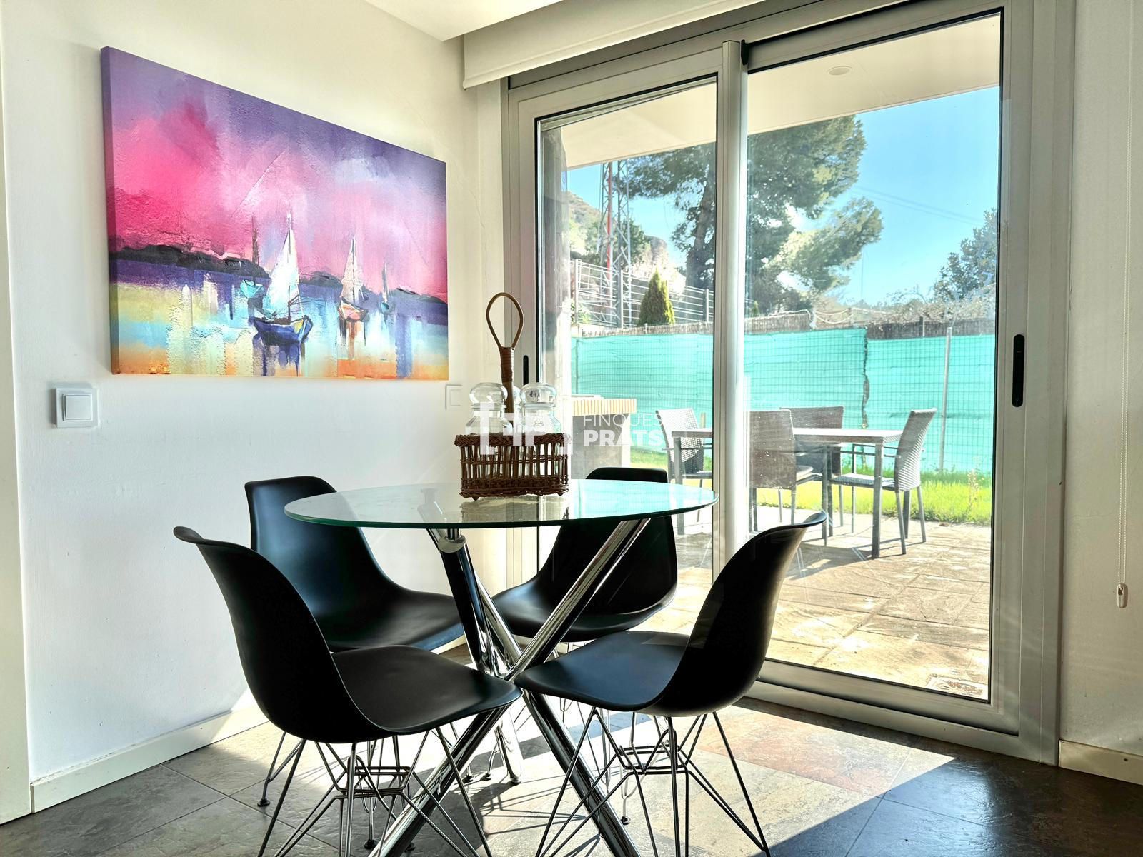 En cuanto a calidades, la vivienda está equipada con calefacción por suelo radiante mediante sistema de gasoil, aire acondicionado, carpintería exterior de aluminio con doble aislamiento y persianas de aluminio motorizadas y aisladas en toda la vivienda. Todo ello, junto con su orientación y grandes aperturas, permite disfrutar de una casa muy luminosa durante todo el día.